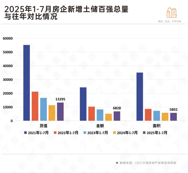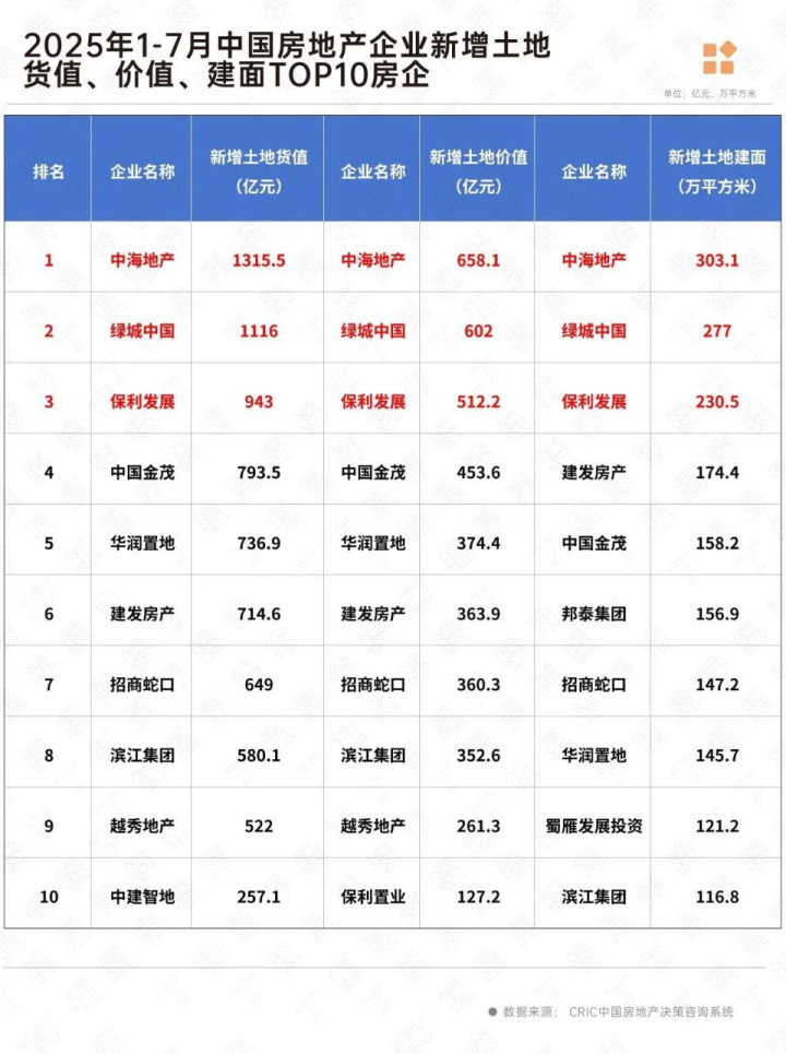 CRIC数据显示,投资百强前七月拿地金额同比增33%,中海地产、绿城中国和保利发展拿地金额位列前三,新增土地价值均超500亿元。